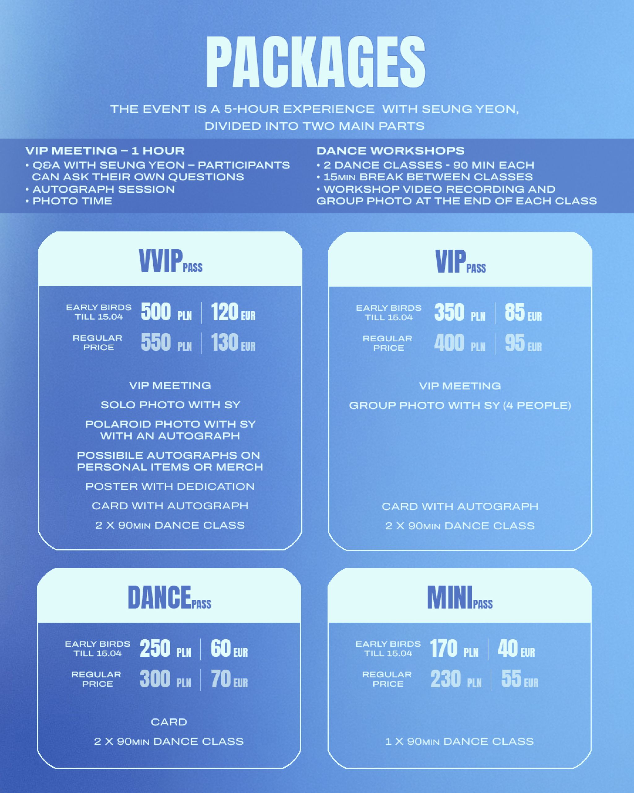 After the VIP session, the event continues with two 90-minute dance classes, where Seung Yeon will teach choreography and share her experience as a performer and choreographer.